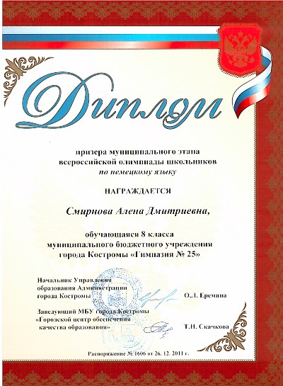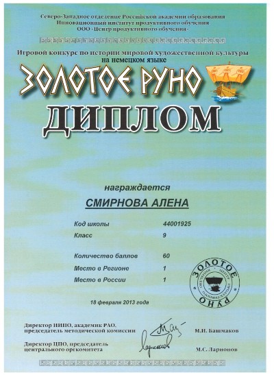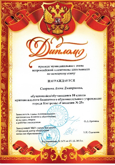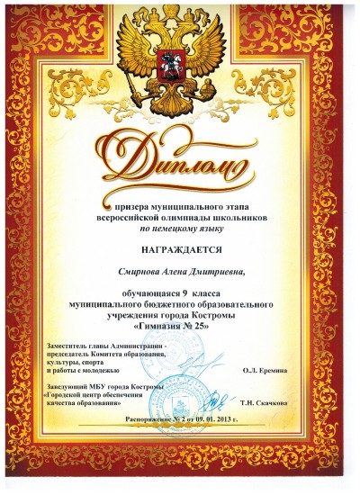 Городская олимпиада по немецкому языку в 9 (2012-2013 уч. г.) и 10 (2013-2014 уч. г.) классах – призёр