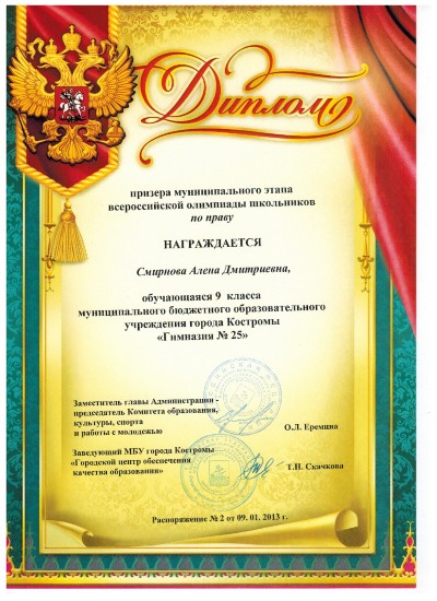 Городская олимпиада по праву в 9 классе (2012-2013 уч. г.) – призёр