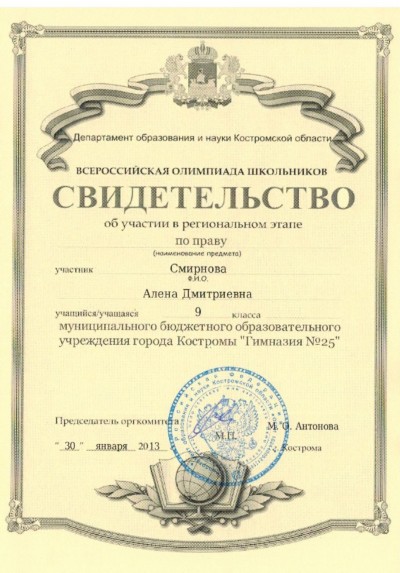 Участие в областной олимпиаде по праву в 9 классе (2012-2013 уч. г.)