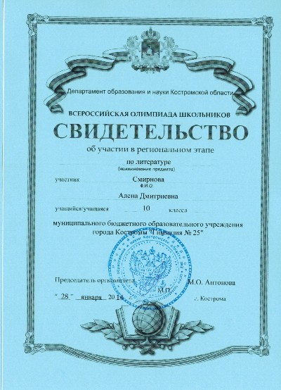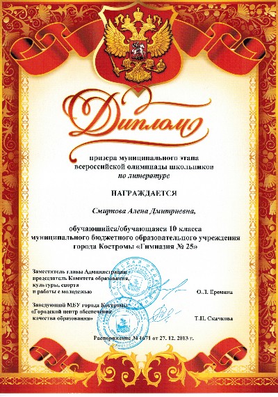 Городская олимпиада по литературе в 10 классе (2013-2014 уч. г.) – призёр
