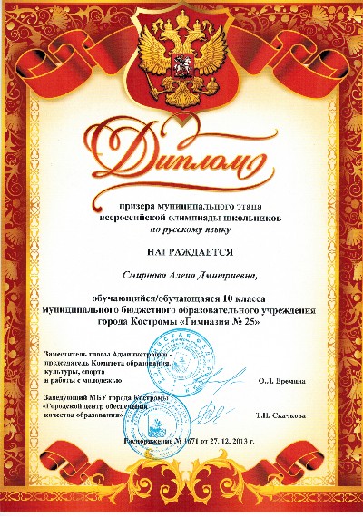 Городская олимпиада по русскому языку в 10 классе (2013-2014 уч. г.) – призёр