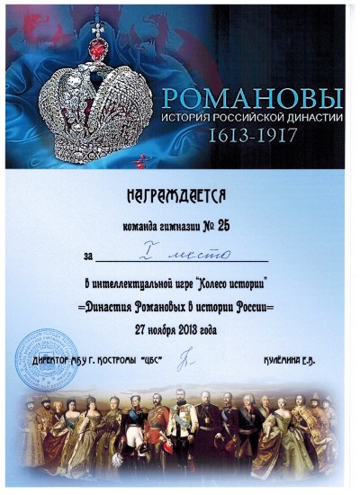1 место в интеллектуальной игре «Колесо истории» в 2013 году