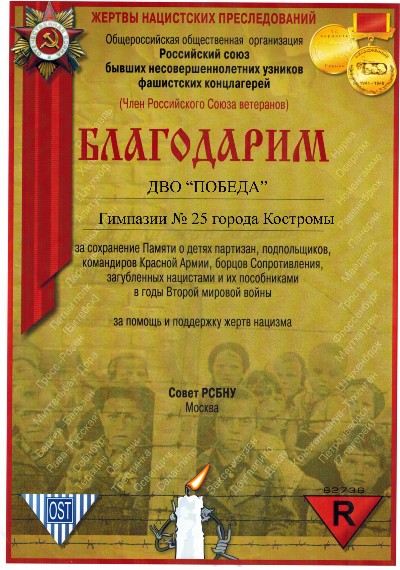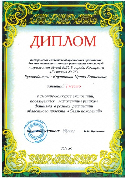 1 место в смотре-конкурсе экспозиций, посвященных малолетним узникам фашизма в рамках реализации областного проекта «Связь поколений»