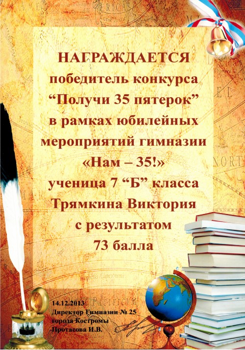 Победитель школьной акции «Получи 35 пятерок», посвященной юбилею гимназии;