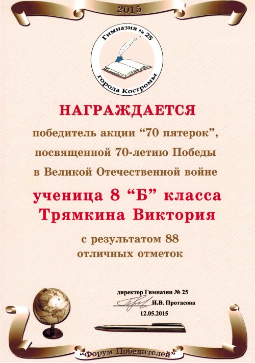Победитель школьной акции «70 пятерок», посвященной 70-летию Победы в Великой Отечественной войне;