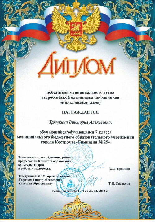 Победитель муниципального этапа Всероссийской олимпиады школьников по английскому языку, 2013;