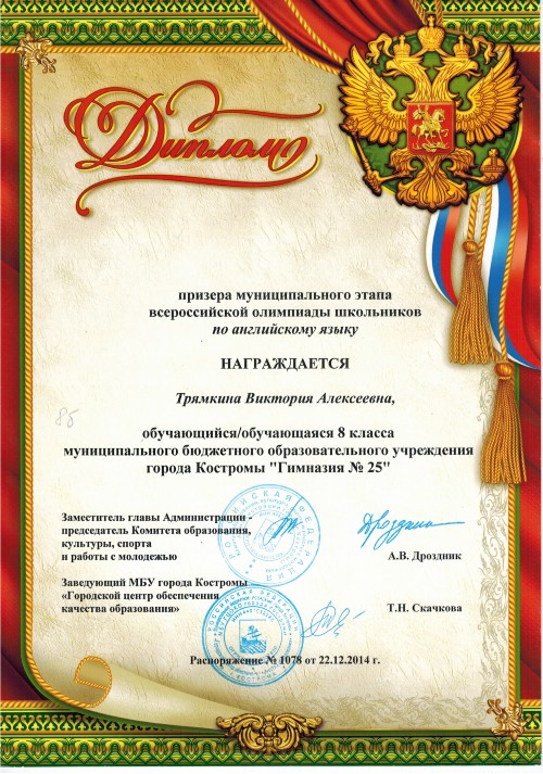 Призер муниципального этапа Всероссийской олимпиады школьников по английскому зыку, 2014;