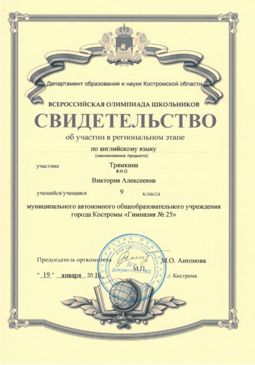 Участник регионального этапа Всероссийской олимпиады школьников по английскому зыку, 2015