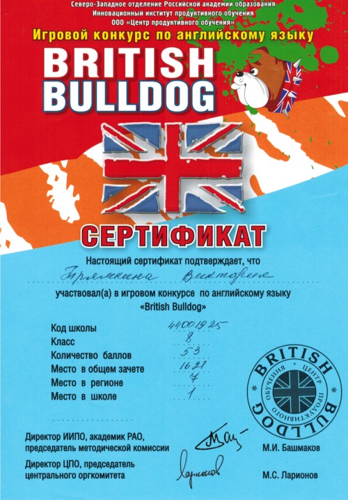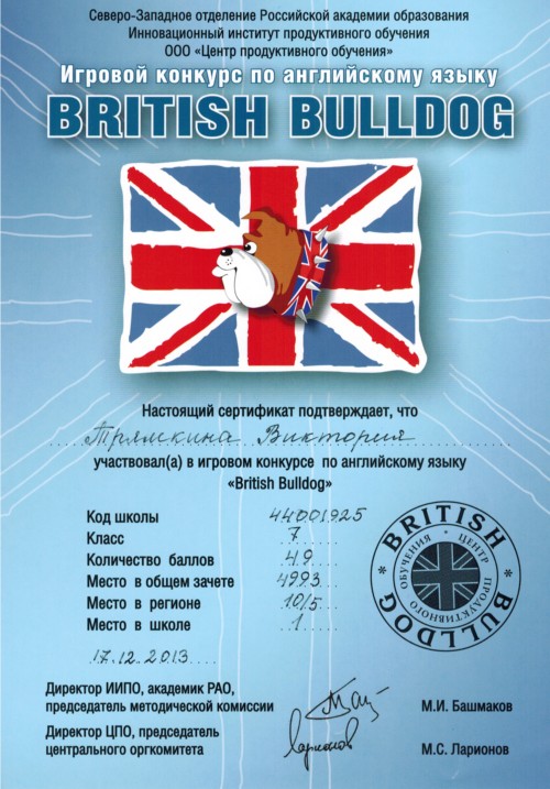 Сертификат призера международного конкурса «Британский бульдог», 2013;