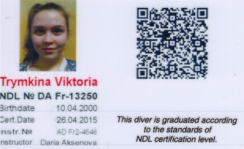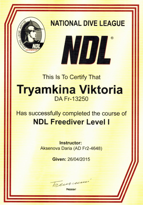 Получила удостоверение пловца-ныряльщика 1,2,3 степеней, международный сертификат NDF первого уровня (Национальная Лига дайверов) |