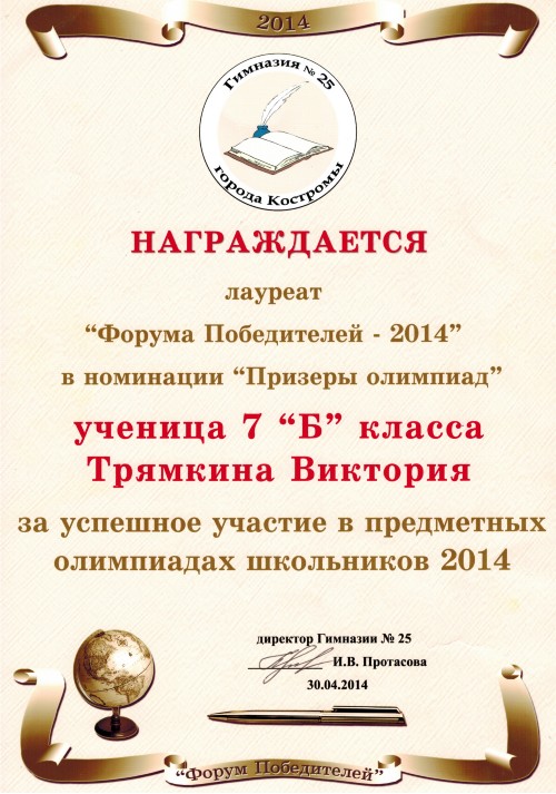 Похвальный лист «За отличные успехи в учении», 2014г.