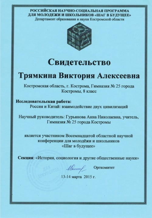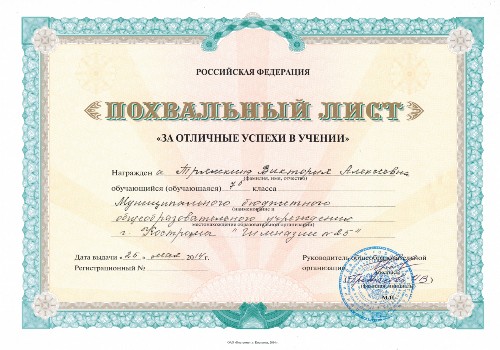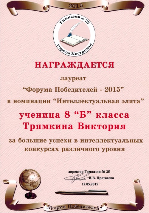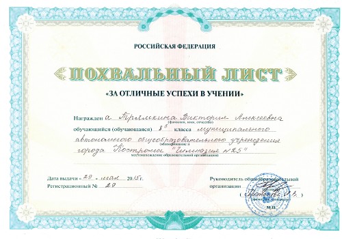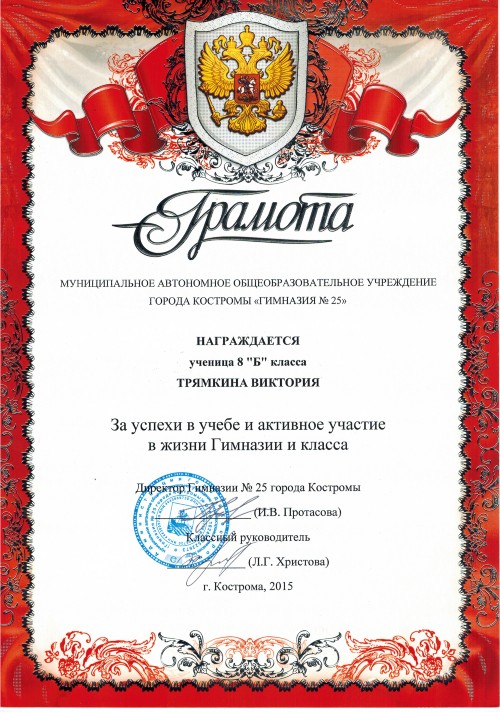 Похвальная грамота «За успехи в учебе и активное участие в жизни гимназии и класса», 2015г;