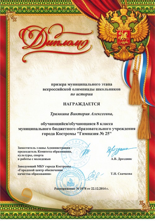 Призер муниципального этапа Всероссийской олимпиады школьников по истории, 2014;