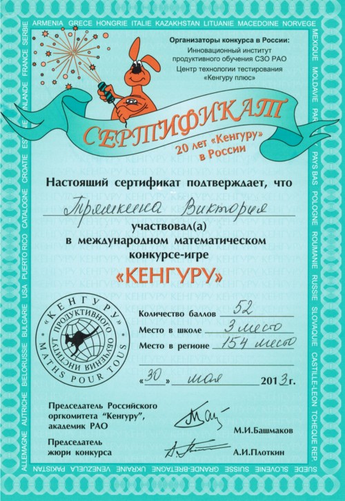 Участник международного математического конкурса «Кенгуру» (место в школе), 2013;