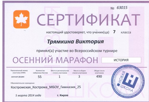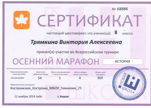 Участник всероссийского турнира «Осенний марафон» оп истории (4 место в общем списке), ноябрь 2014;
