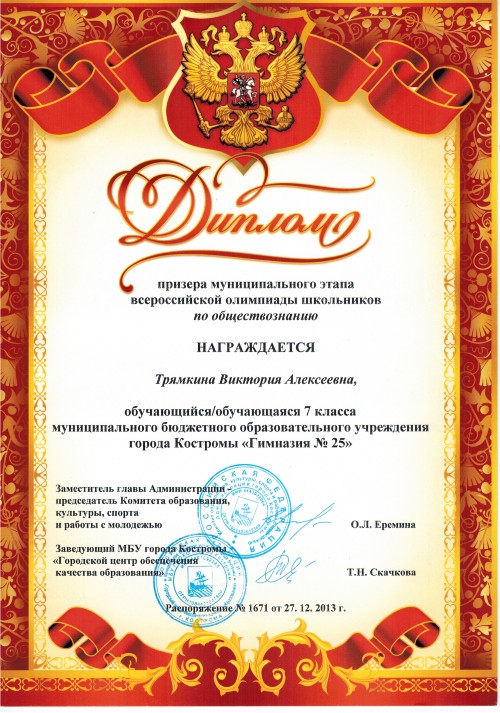 Призер муниципального этапа Всероссийской олимпиады школьников по обществознанию, 2013;