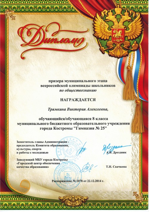 Призер муниципального этапа Всероссийской олимпиады школьников по обществознанию, 2014;